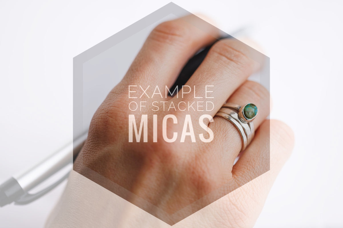 Mica is a series of stackable rings, easily paired with silver bands of hammered or smooth textures. (see photo for example)